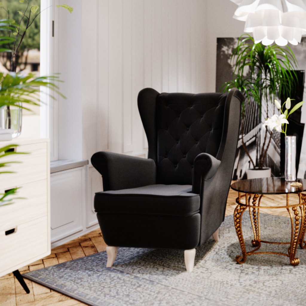 křeslo je volně stojící (zadní část potažena černou tkaninou)